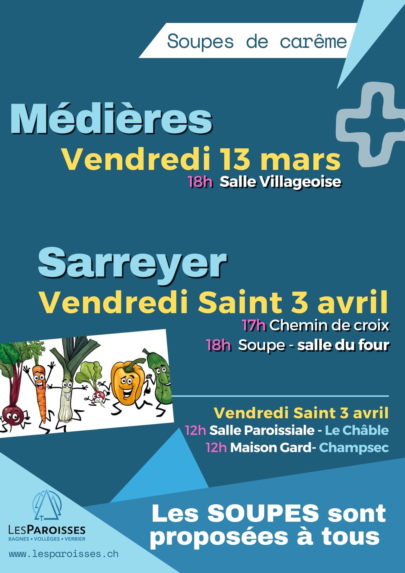 Soupe de carême le vendredi 13 mars dès 18h. Venez partager ce temps et partager un peu de ce que nous avons avec ceux qui ont moins à la salle villageoise de Médières.