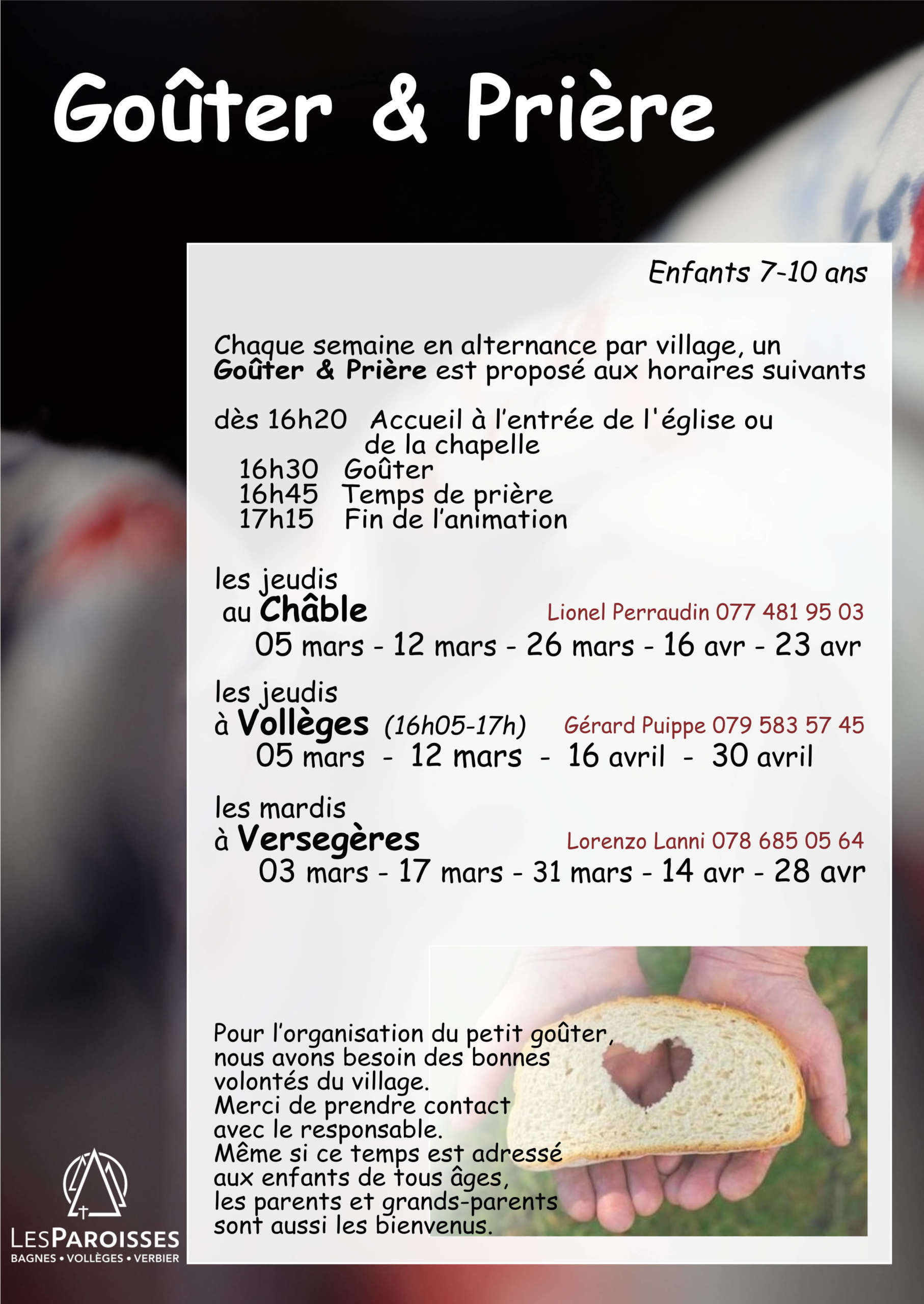 - 16h30 Goûter à l’entrée de l’église ou de la chapelle (adapté un peu selon les transports dans certains lieux)