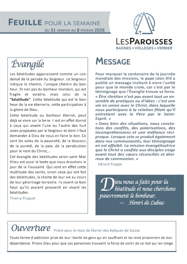 29 Juin 0Likes Posted by LesParoisses GP Categories: Non classé Ouvrir ou télécharger le feuillet en .pdf 22 octobre 2025 Participe aux actions solidaires des paroisses ! 3:00